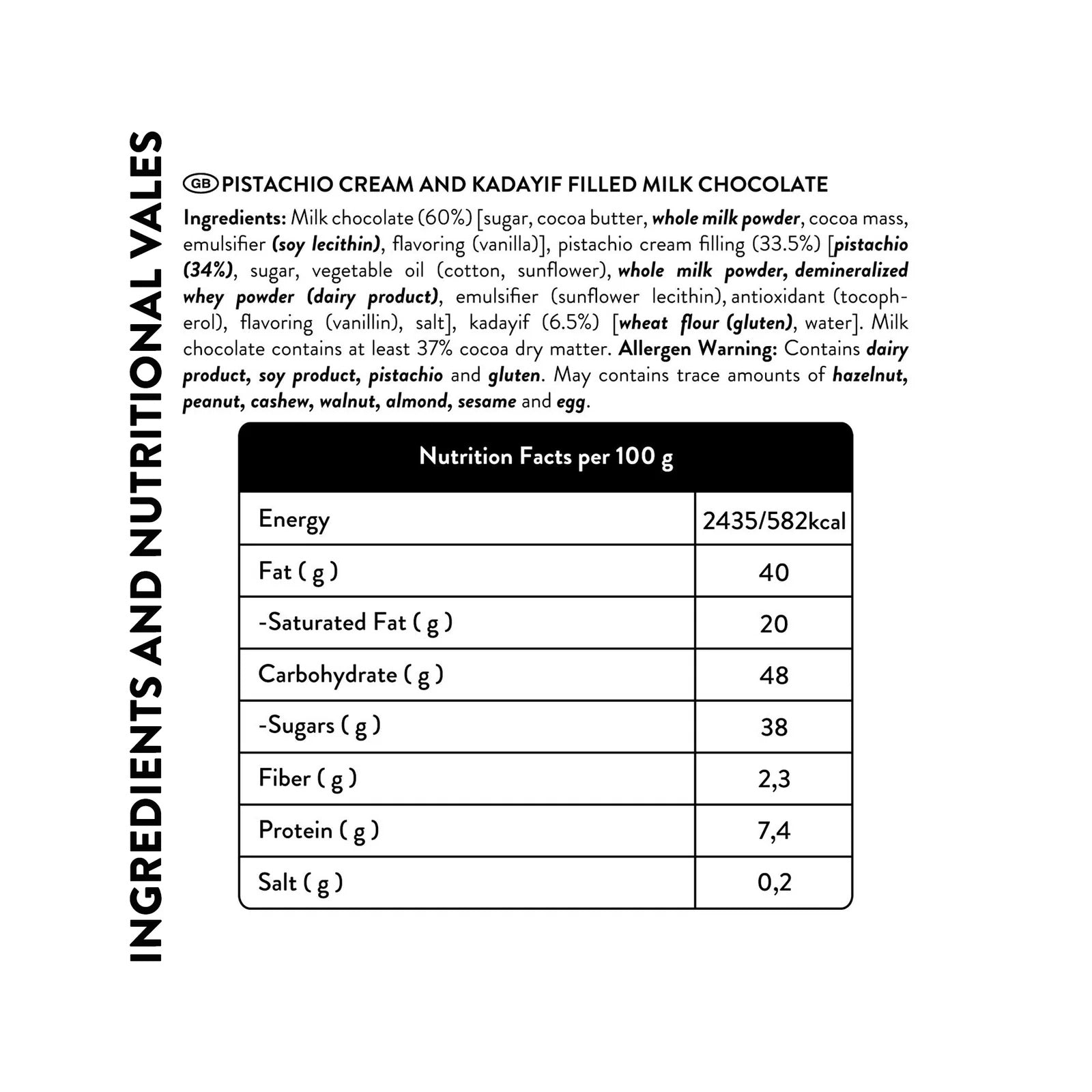 • Premium Ingredients: Crafted with 60% creamy milk chocolate, 35% rich pistachio filling, and 8% crispy knafeh, delivering a harmonious blend of textures and flavors.