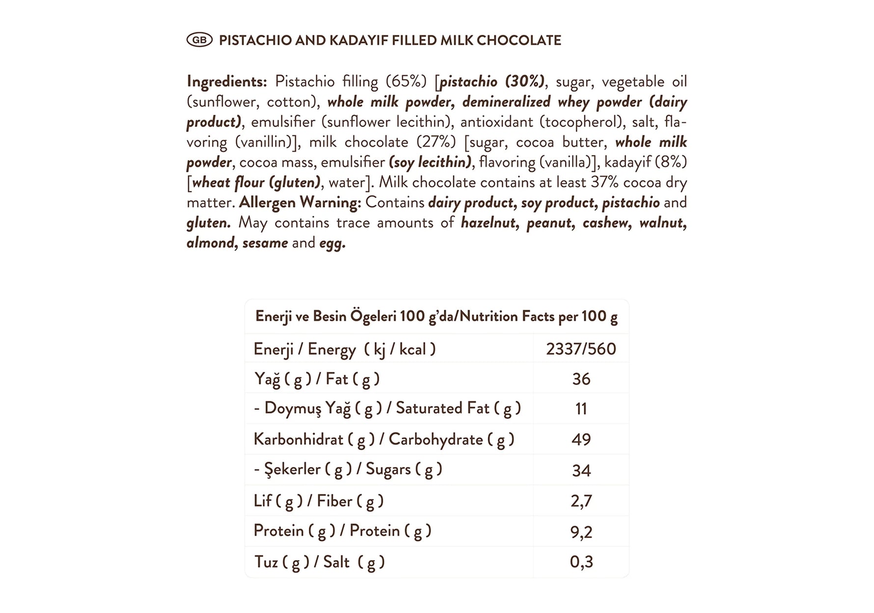 • Premium Ingredients: Crafted with 60% creamy milk chocolate, 35% rich pistachio filling, and 8% crispy knafeh, delivering a harmonious blend of textures and flavors.